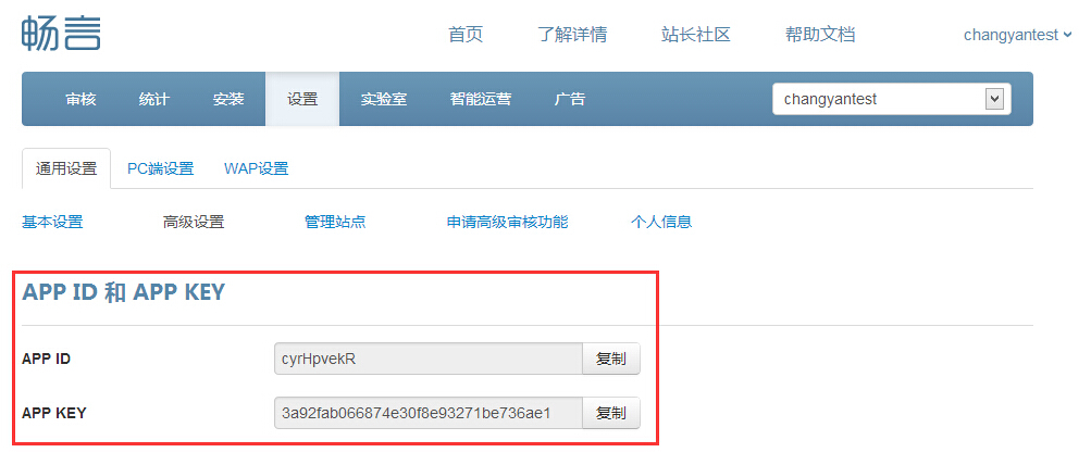 3、在后台-设置-通用设置-高级设置 中,获取您的appid和appkey