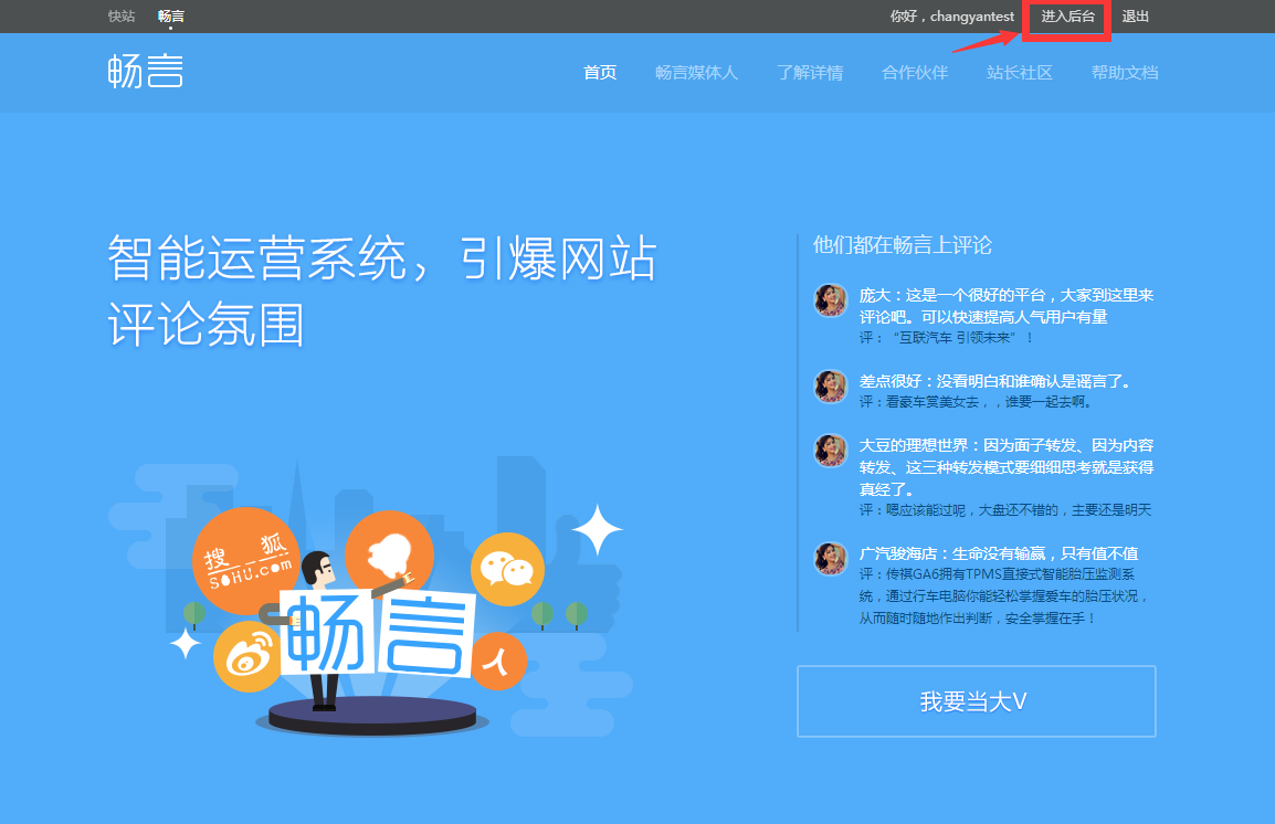 注册完成以后,回到云评论官网 http://changyan.kuaizhan.com ,登录后进入云评论后台。