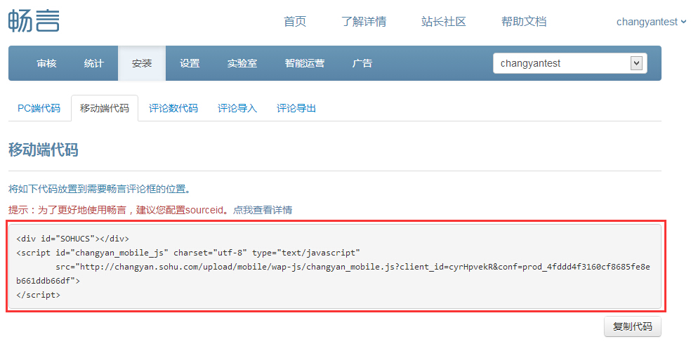 3、在后台-安装-移动端代码中获取”移动端代码“