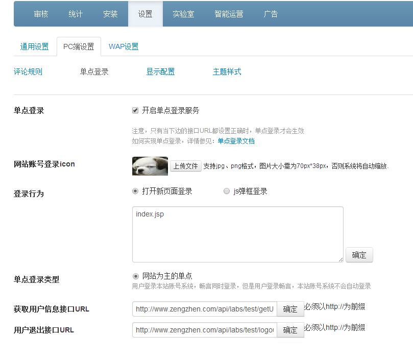 首先在你的云评论后台 设置-PC端设置-单点登录,勾选单点登录框,按需要上传登录头像,填写你的登录页面,最后完成三个接口地址填写,如下图所示。(注:如果对三个接口的含义不明确,请参照单点登录接口文档)